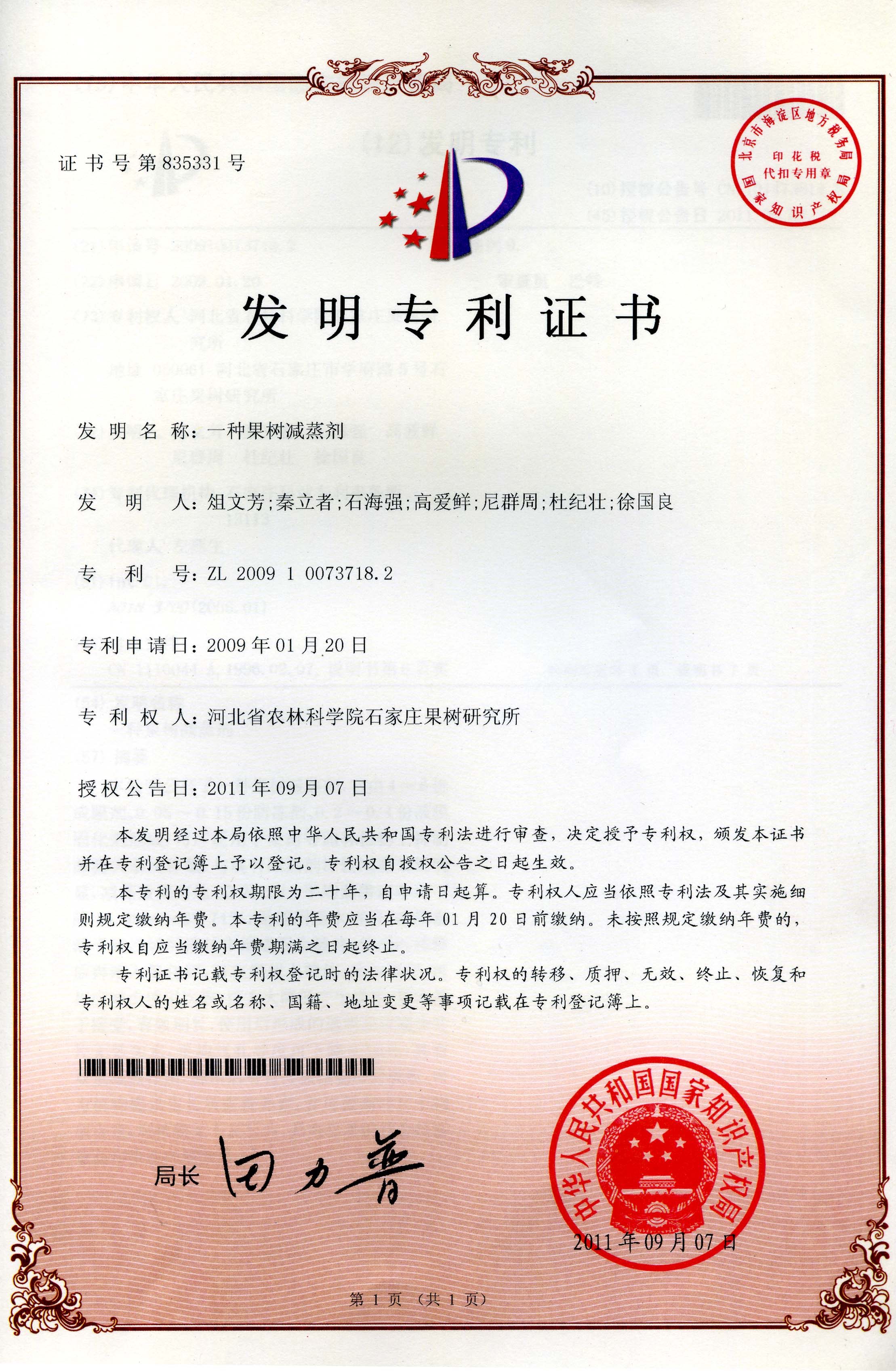 本發明目的是提供一種不僅適用于果樹同時也適用于其他農林作物的可顯著減少水分散失的減蒸騰劑為達到上述目的,本發明的技術方案為:將0.05~0.15重量份的尿素溶于4~6重量份的聚乙烯醇液體中形成混合液體,田間使用時再將該混合液體與水按1:100~150的比例稀釋后,再溶入0.2~0.4重量份的氯化鈣,稍加攪拌溶解后即可在果樹樹體上噴施。減蒸劑其特征在于它是由下列重量份的原料制成:成膜劑4~6,防凍劑0.05~0.15,液膜固化劑0.2~0.4。所述成膜劑采用聚乙烯醇,聚乙烯醇具有成膜作用,可在植物葉片上形成一層半透膜,從而有效阻止水分的散失;所述防凍劑采用尿素,其防凍機理為冬季施用時,降低低溫對成膜劑效果的影響,同時還可為植物提供氮素營養;所述液膜固化劑采用氯化鈣,他不僅可使聚乙烯醇形成的液膜及時固化成膜,同時具有減蒸作用,并可為植物提供鈣素營養成分。