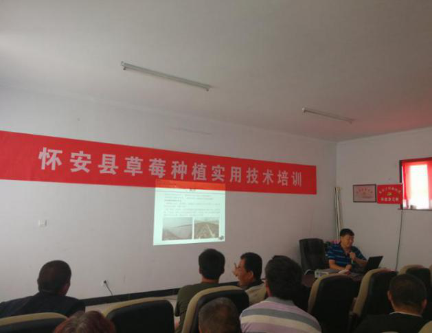 2018~2019年草莓研究室成員多次赴河北省石家莊鹿泉、正定、藁城、欒城、平山、新集,張家口懷安,保定安新、淶水、滿城、博野等地草莓產區進行技術服務,講解草莓品種選擇、育苗技術、病蟲害防治、溫室栽培等技術,以室內講座、田間指導以及電臺講解等多種形式為農民培訓,為莓農增收及河北省的草莓產業發展做出了積極的貢獻。