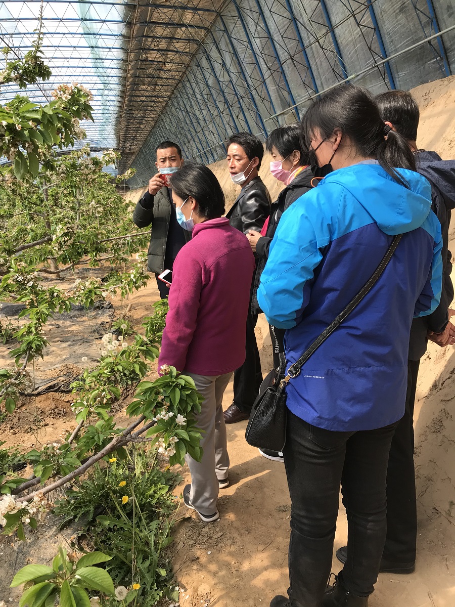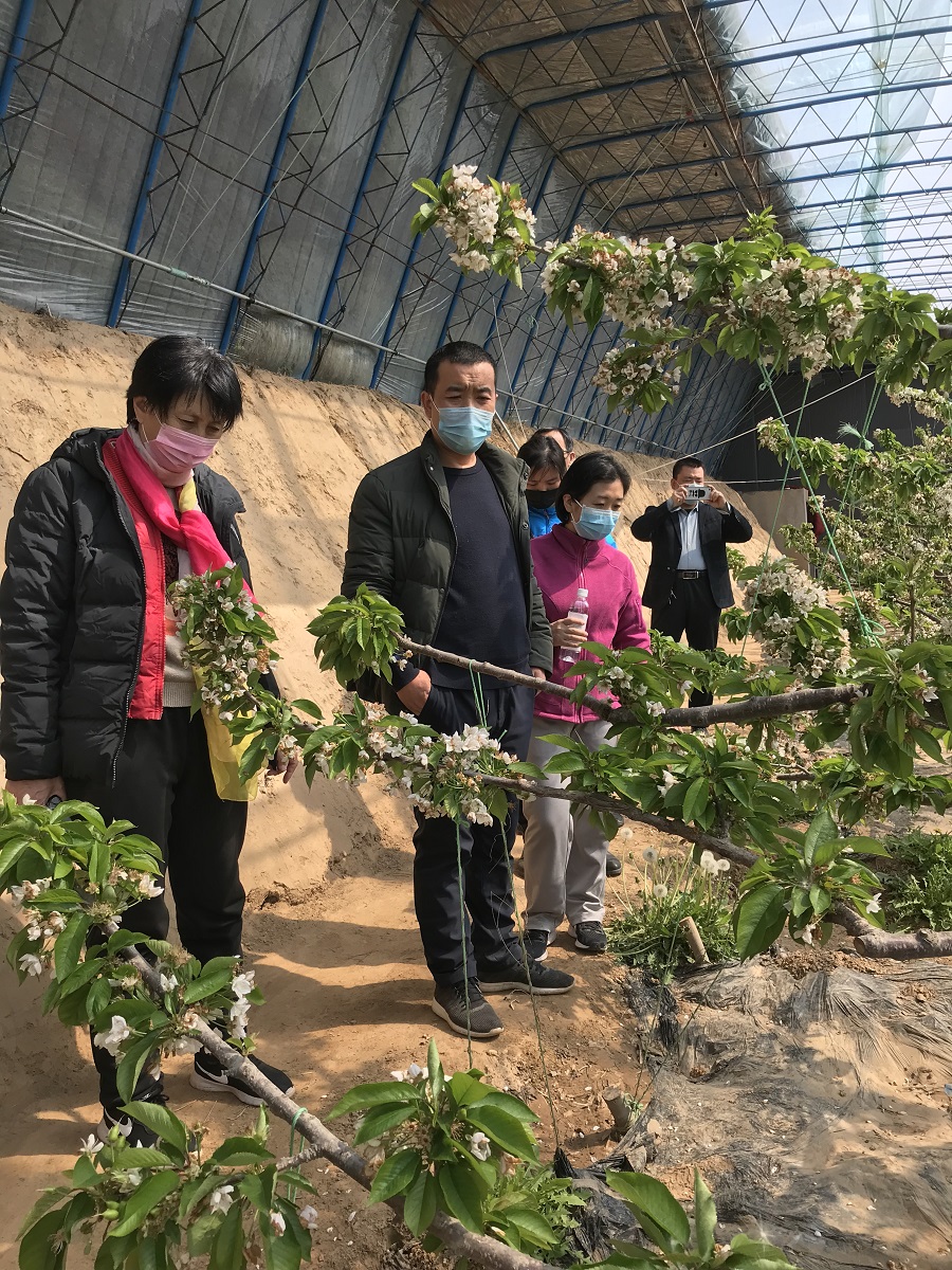 在基地,科研團隊實地查看了杏花芽萌發情況及接穗存儲條件,對園區杏花期管理及后續的嫁接工作提出了建議。會同巨鹿縣林業局工作人員,考察了園區櫻桃、桃等溫室大棚,并對櫻桃出現的黃葉狀況進行了解析,提出具體的技術建議。
