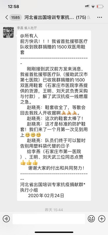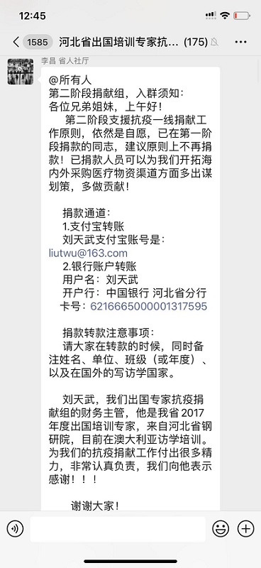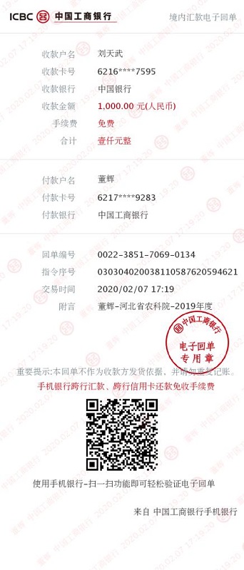 2020年2月7日,河北省農(nóng)林科學院石家莊果樹研究所綜合實驗室主任董輝副研究員積極響應河北人社廳專家與留學人員服務(wù)中心的號召,捐獻人民幣1000元整, 用于出國培訓專家從海外采購急缺的、關(guān)鍵的醫(yī)療物資,特別是防護服和N95口罩、護目鏡等等,捐贈我省援鄂抗疫醫(yī)療隊和我省各大醫(yī)院。