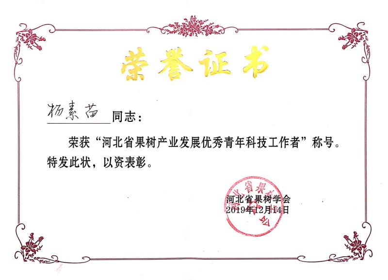 楊素苗同志榮獲“河北果樹產業發展優秀青年科技工作者”稱號