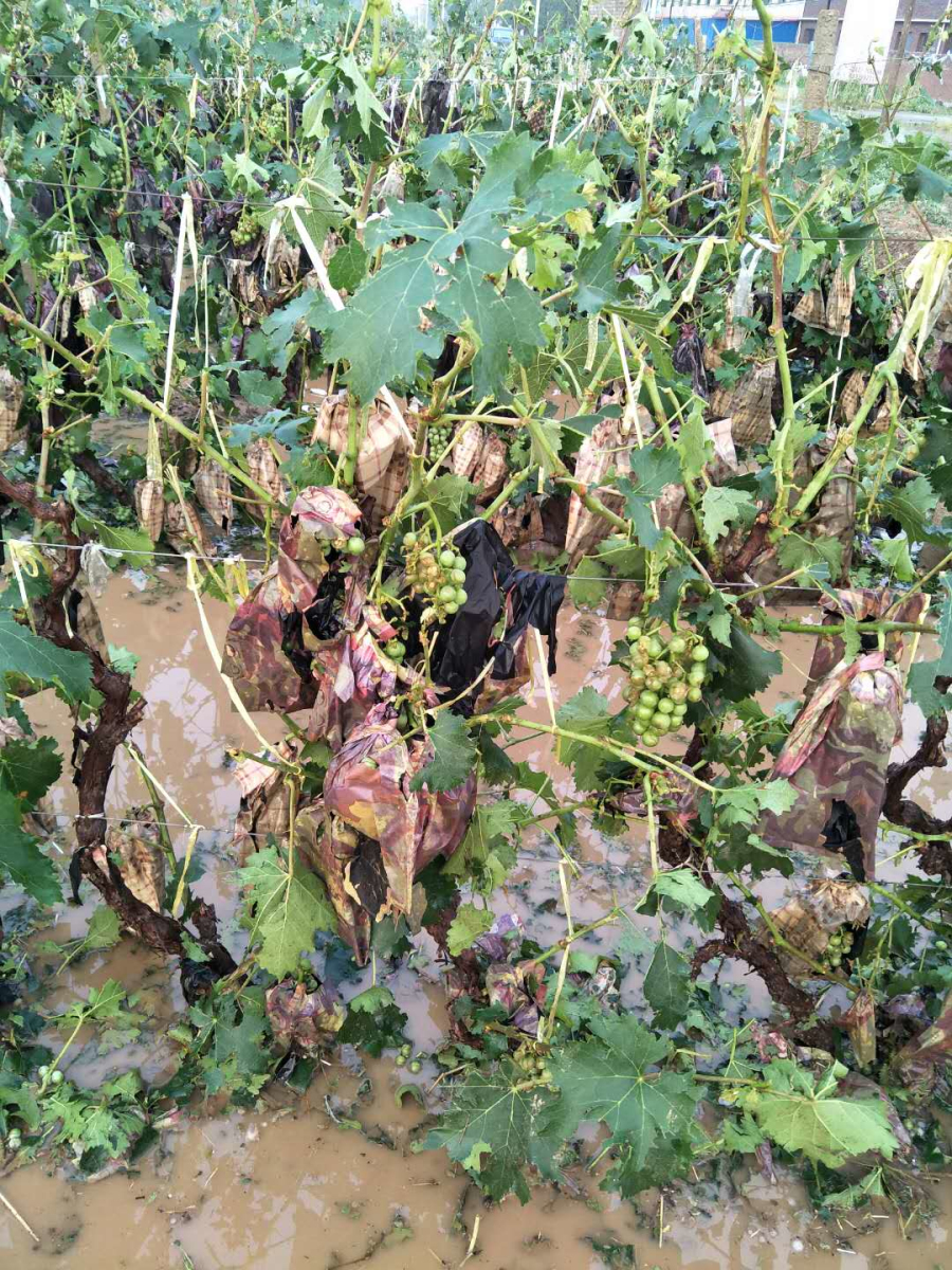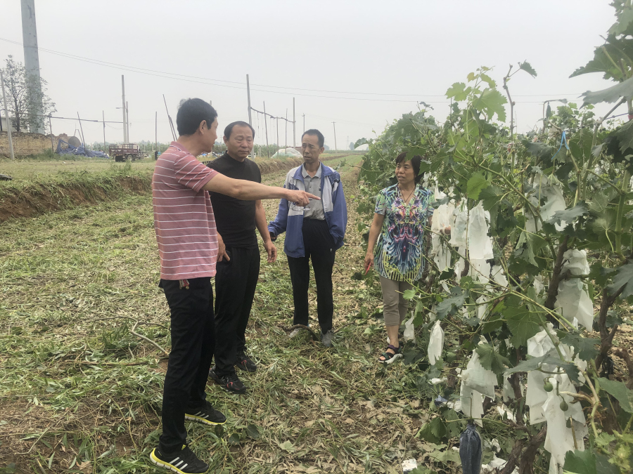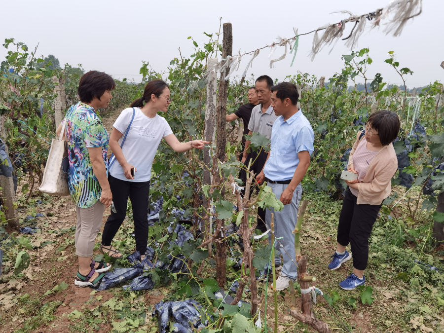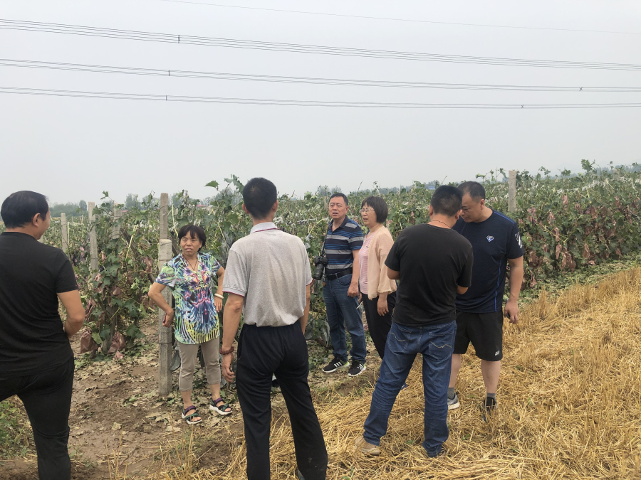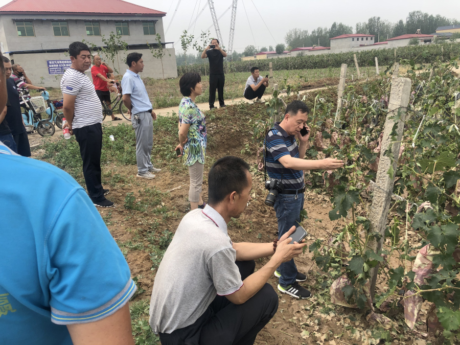 雹災發生后,石家莊果樹研究所褚鳳杰研究員立即通過電話、微信等方式與基地人員聯系,了解葡萄受害程度。翌日一早褚鳳杰研究員帶領團隊成員赴順平、滿城現場展開調研,并會同省水果體系杜國強教授等專家及當地農業部門商討了救災應對方案。
