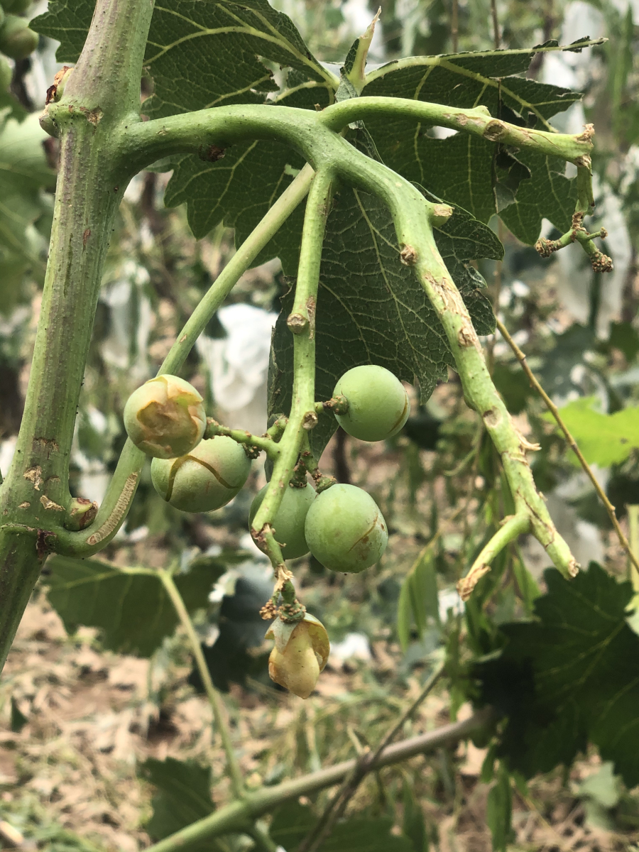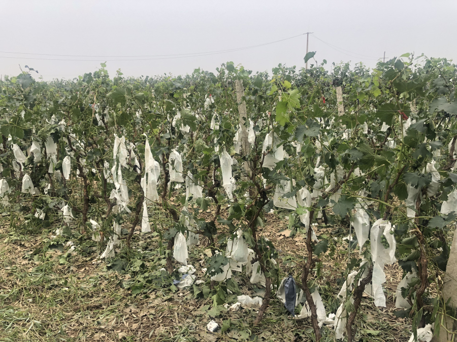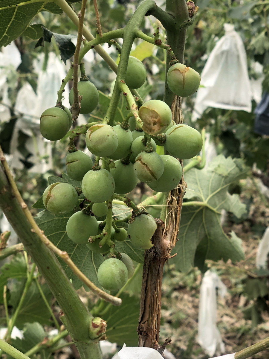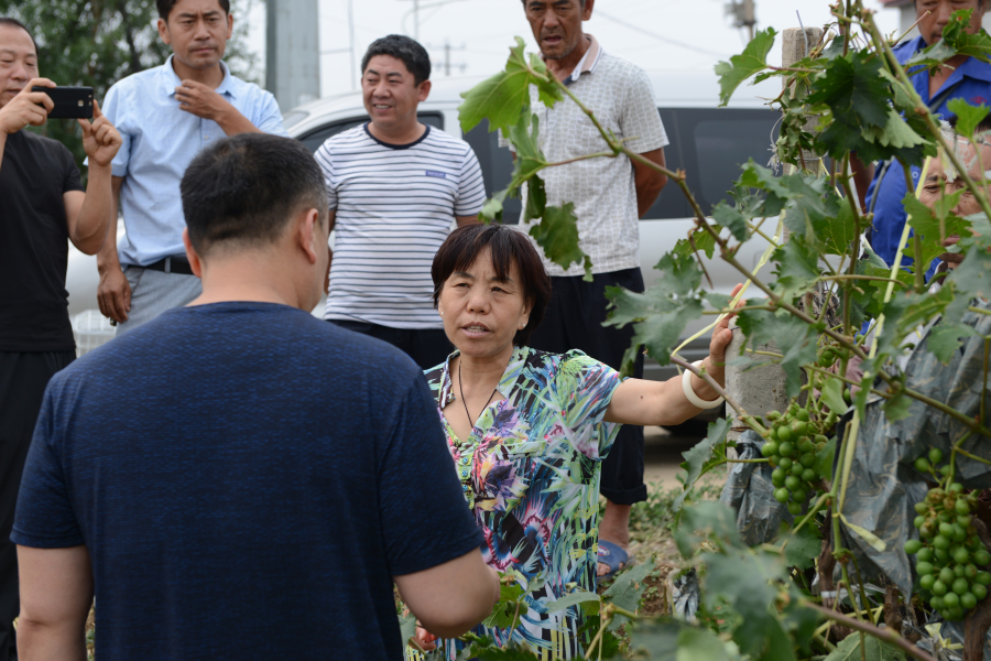 雹災發生后,石家莊果樹研究所褚鳳杰研究員立即通過電話、微信等方式與基地人員聯系,了解葡萄受害程度。翌日一早褚鳳杰研究員帶領團隊成員赴順平、滿城現場展開調研,并會同省水果體系杜國強教授等專家及當地農業部門商討了救災應對方案。