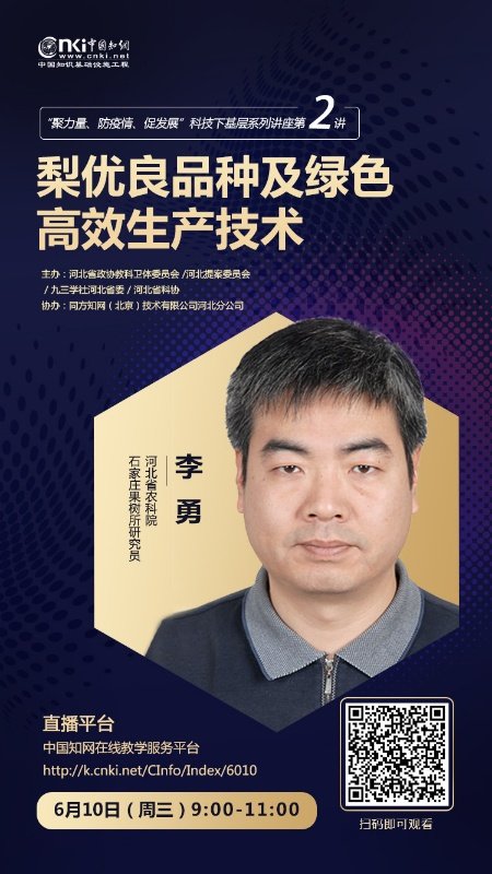 6月10日,我所梨研究室主任李勇研究員在中國知網在線教學服務平臺主講了“凝力量、防疫請、促發展”科技下基層系列講座第2講。本系列講座是由河北省政協教科衛體委員會、河北提案委員會、九三學社河北省委、河北省科協主辦。李勇研究員以"梨優良品種及綠色高效生產技術"為題進行了講座。
