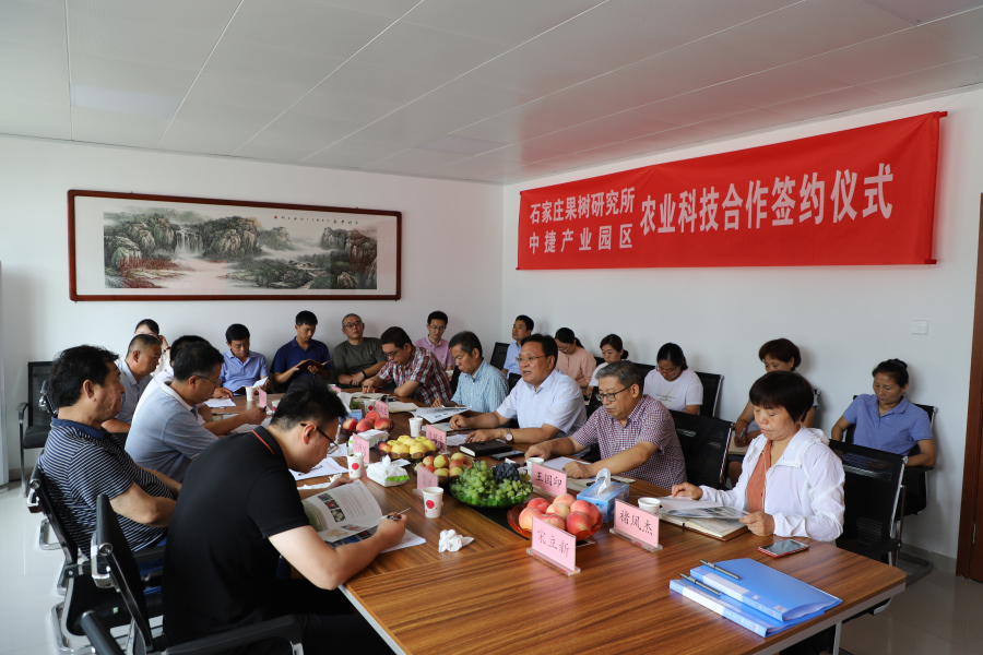 簡短的歡迎儀式后,石果所總支書記、所長龐昭進介紹了雙方合作的基礎和優(yōu)勢,認為本次合作正可謂天時、地利、人和,今天的簽約儀式是良好的開端,能促進合作向更深更高的層次發(fā)展。中捷產(chǎn)業(yè)園區(qū)黨委委員、管委會副主任于連治在講話中強調(diào),此次合作正值園區(qū)難以破解農(nóng)業(yè)如何發(fā)展、如何管理、如何重建技術(shù)服務體系的難題之時,雙方達成合作共識,強強聯(lián)合,定能結(jié)出碩果。