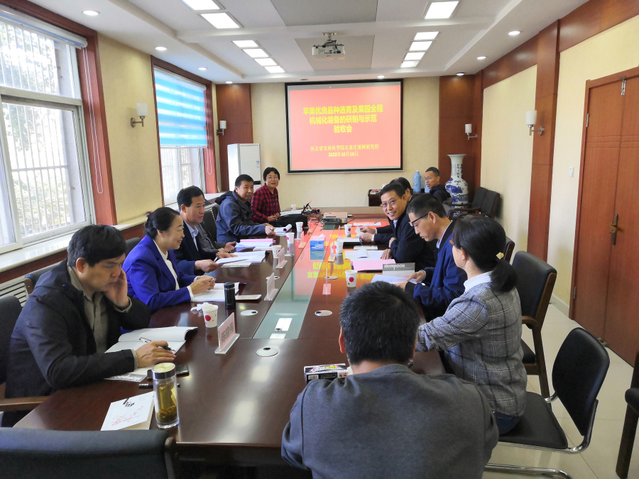 2020年10月16日,河北省科技廳組織,邀請河北農業大學、河北省林業和草原技術推廣總站、河北省農業機械研究所有限公司、河北省社會科學院等單位專家組成驗收組,對河北省農林科學院石家莊果樹研究所等單位承擔的河北省科技計劃項目“蘋果優良品種選育及果園全程機械化裝備的研制與示范”(編號:18226821D)進行了驗收。
