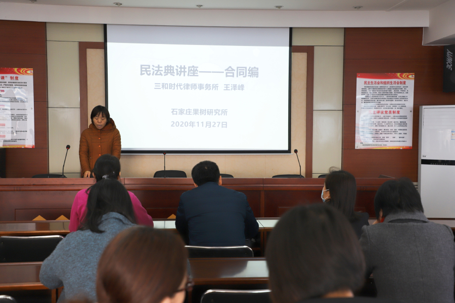 《中華人民共和國民法典》將在2021年1月1日開始執(zhí)行。作為新中國第一部以法典命名的法律,在法律體系中居于基礎(chǔ)性地位且對我們每個人都至關(guān)重要。為認(rèn)真貫徹落實院機(jī)關(guān)黨委《關(guān)于加強(qiáng)民法典學(xué)習(xí)宣傳的通知》精神,普及民法知識,提升個人法律素養(yǎng),降低法律風(fēng)險,2020年11月27日我所邀請三和時代律師事務(wù)所王澤峰律師為大家進(jìn)行了民法典(合同編)講座。