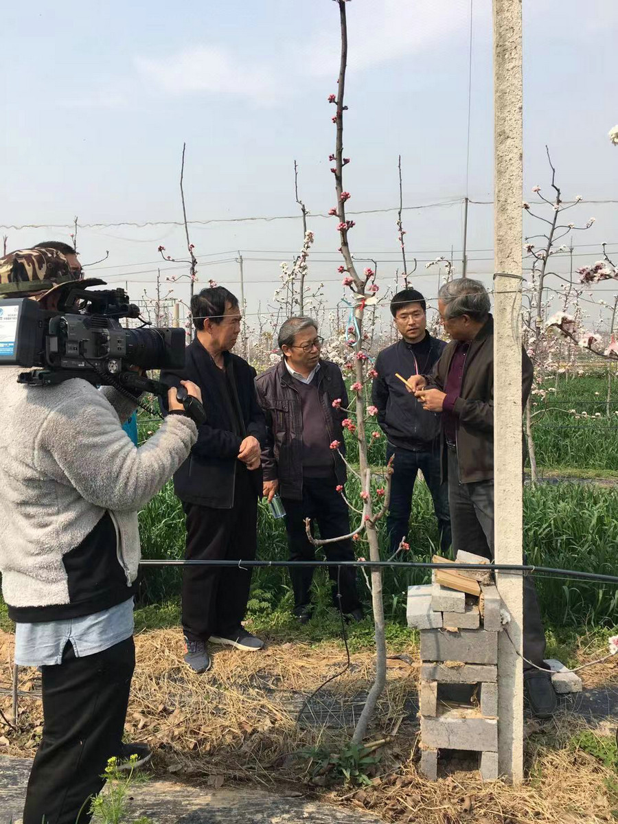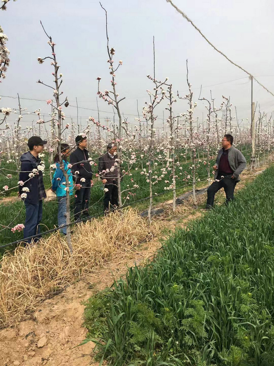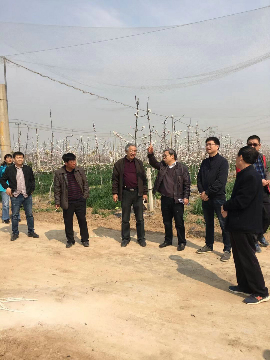 2021年4月6日院成果處王國印處長、鄭小六副處長等一行到我所武邑武羅基地進行了調研。董輝副所長介紹了基地概況,杜紀壯研究員就武羅紅梨基地現場介紹了梨樹管理、梨樹花期風扇防凍、壁蜂授粉、水肥一體化等情況;劉鐵錚研究員介紹了梨、蘋果新品種引進及栽培情況。