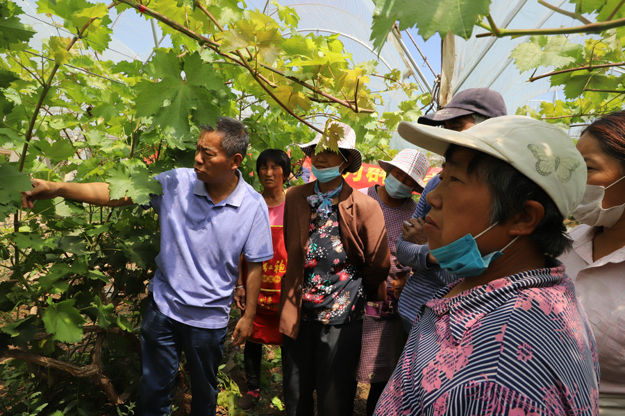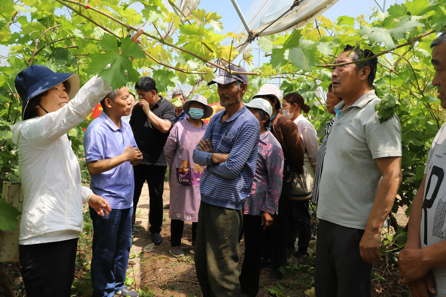 葡萄專家褚鳳杰首先利用多媒體技術(shù)手段為梅莊村村民講解了當(dāng)?shù)剡x種的陽光玫瑰與克瑞森葡萄品種的種植、生產(chǎn)相關(guān)知識。隨后,來到葡萄種植大棚,查看了兩個品種的長勢,針對目前坐果少、果實生長不均勻等問題開出藥方并現(xiàn)場進(jìn)行修剪示范。馮建忠研究員對改善目前果實生長情況給出了中肯的建議,一定要依照現(xiàn)有基礎(chǔ),有側(cè)重地進(jìn)行管理,爭取效益最大化。
