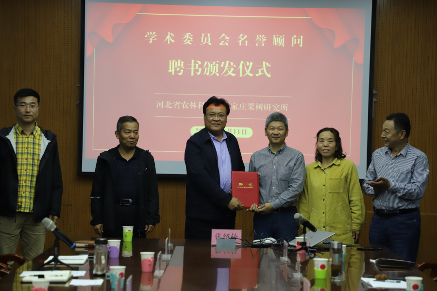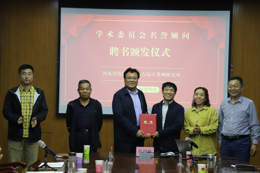 2021年10月11日,我所為張紹鈴教授和施澤彬研究員舉行頒發聘書儀式。聘請張紹鈴教授為國家梨改良中心名譽主任,聘請施澤彬研究員為國家梨改良中心學術委員會委員。所長龐昭進為兩位專家頒發聘書,他表示,有了兩位專家的助力和獻言獻策,石家莊果樹研究所和國家梨改良中心的科研實力和學術水平也將更上一層樓。石果所領導班子、專家顧問、研究室主任和科技骨干共40余人參加了頒發儀式。