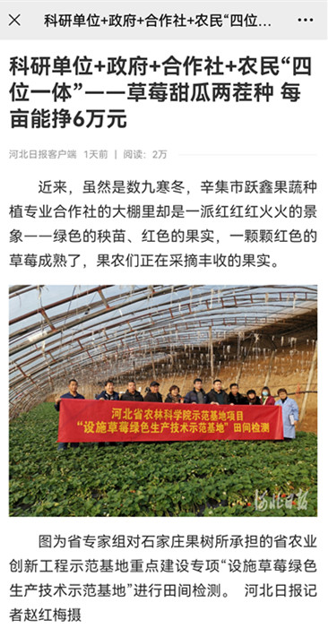 省農(nóng)科院石家莊果樹所的科研人員在合作社建立了試驗(yàn)示范基地,主要開展新品種及新技術(shù)試驗(yàn)示范,先后引進(jìn)示范紅星、冀香、京藏香、寧玉等國產(chǎn)自育品種。在草莓生長關(guān)鍵期,科研人員加強(qiáng)對(duì)基地進(jìn)行綠色生產(chǎn)技術(shù)培訓(xùn)及田間技術(shù)指導(dǎo),讓果農(nóng)能夠熟練掌握良種良法配套種植技術(shù)。