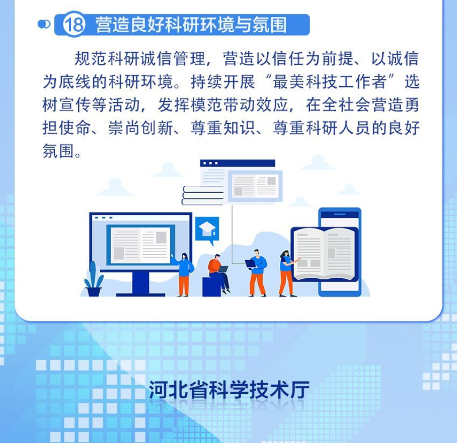 日前,河北省科技廳印發《關于服務科研人員激發創新活力的若干措施》(以下簡稱“若干措施”),圍繞科研人員減負助力、科研人員創新活力激發、釋放科研人員創新潛力三方面提出18項具體措施。