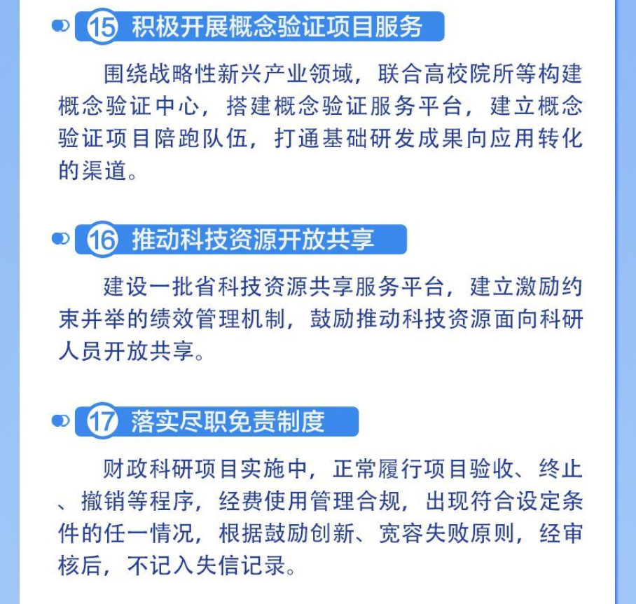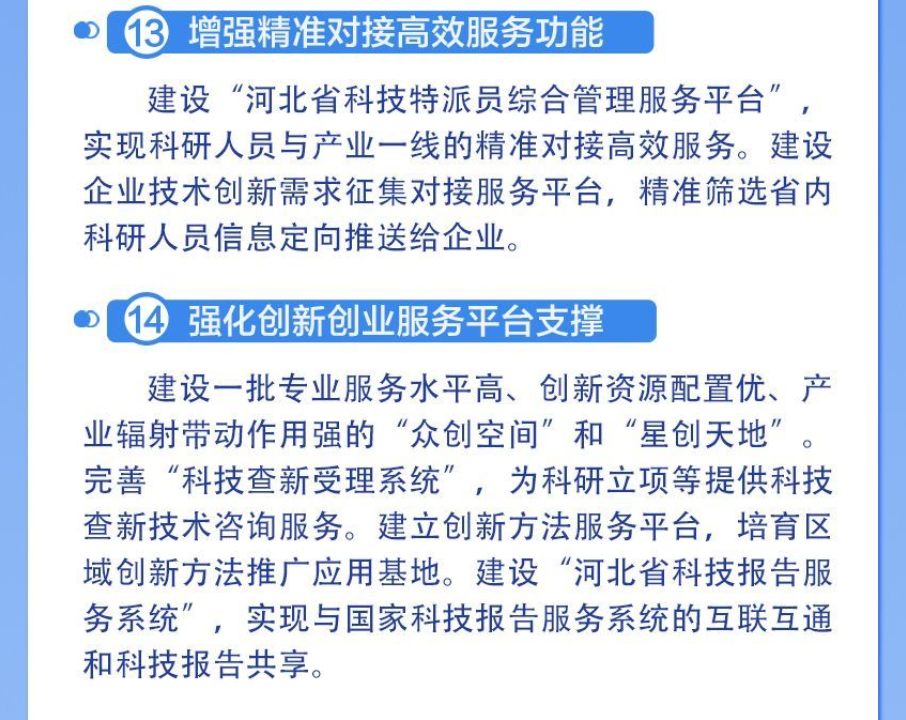 強化全面服務支撐,釋放科研人員創新潛力方面,提出加強青年科技人才隊伍建設、深化對外交流與合作服務、增強精準對接高效服務功能、強化創新創業服務平臺支撐、積極開展概念驗證項目服務、推動科技資源開放共享、落實盡職免責制度、營造良好科研環境與氛圍八項措施,建設河北省科技特派員綜合管理服務平臺、企業技術創新需求征集對接服務平臺,鼓勵創新、寬容失敗,夯實河北省科技創新的人才支撐、平臺支撐和政策支撐,破解科研人員匯聚涌流、創新創業瓶頸,厚植創新文化土壤,營造真心愛才、悉心育才、傾心引才、精心用才的良好創新環境。