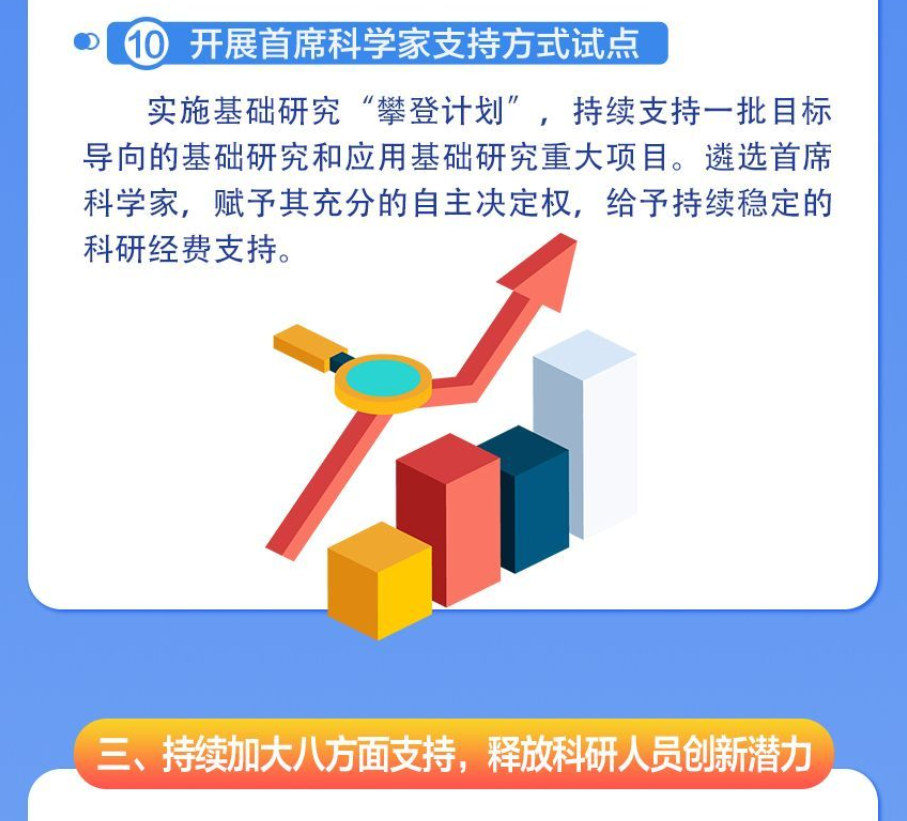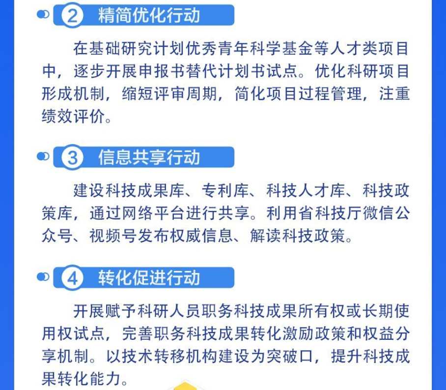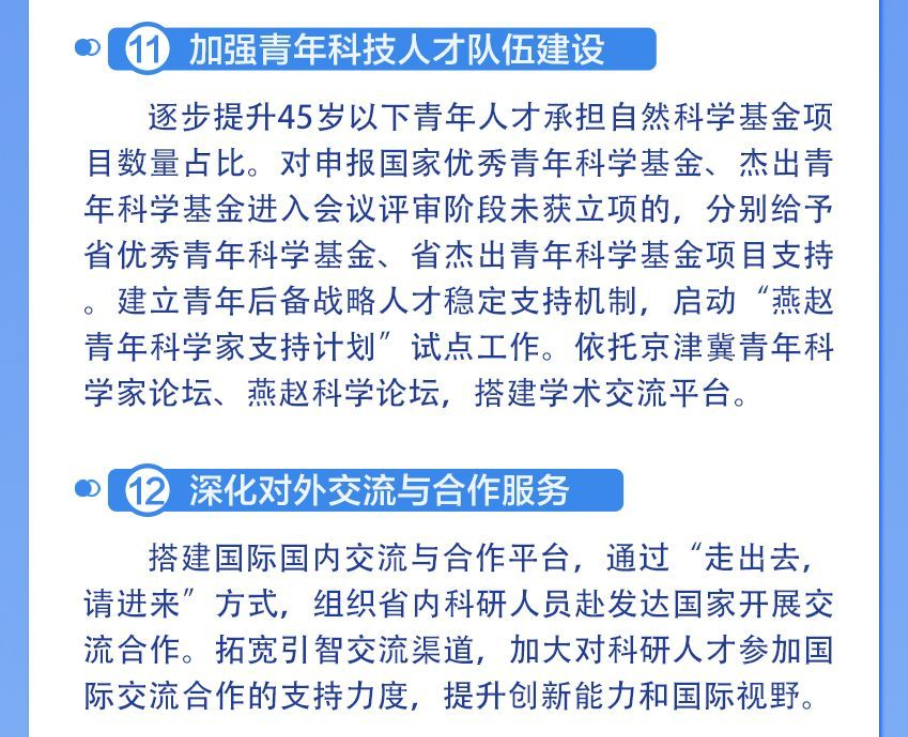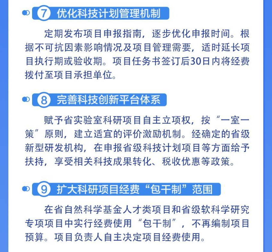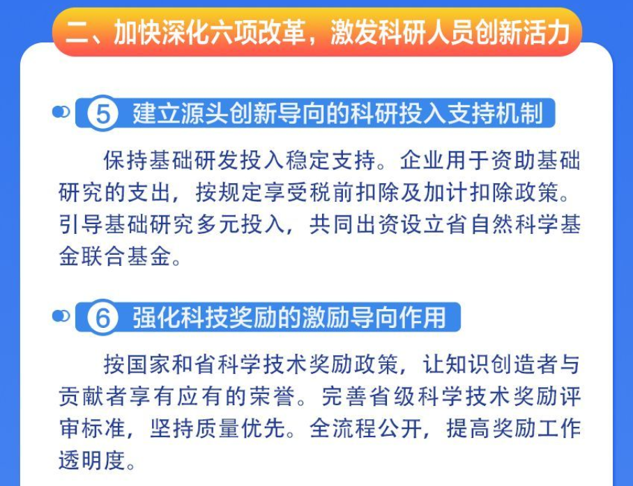 破除科研體制機制障礙,激發科研人員創新活力方面,提出建立源頭創新導向的科研投入支持機制、強化科技獎勵的激勵導向作用、優化科技計劃管理機制、完善科技創新平臺體系、擴大科研項目經費“包干制”范圍、開展首席科學家支持方式試點六項改革措施,落實國家和省科學技術獎勵政策,賦予首席科學家充分的自主決定權并給予持續穩定的科研經費支持,貫通科技活動鏈條和科研成果轉化鏈條的堵點、痛點,化解河北省科研人員的前瞻之慮、后顧之憂,充分釋放科研人員創新活力。