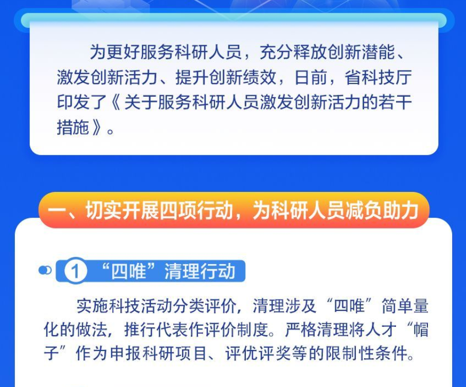 提升科研業務管理效能,為科研人員減負助力方面,提出“四唯”清理、精簡優化、信息共享、轉化促進四項行動,持續清理科技評價活動中涉及“唯論文、唯職稱、唯學歷、唯獎項”等簡單量化的做法,優化科研項目形成機制,完善職務科技成果轉化激勵政策和科研人員職務發明成果權益分享機制,降低對科研活動的干擾,做好科技創新政策宣傳服務,確保科研人員能潛心研究。