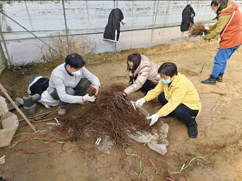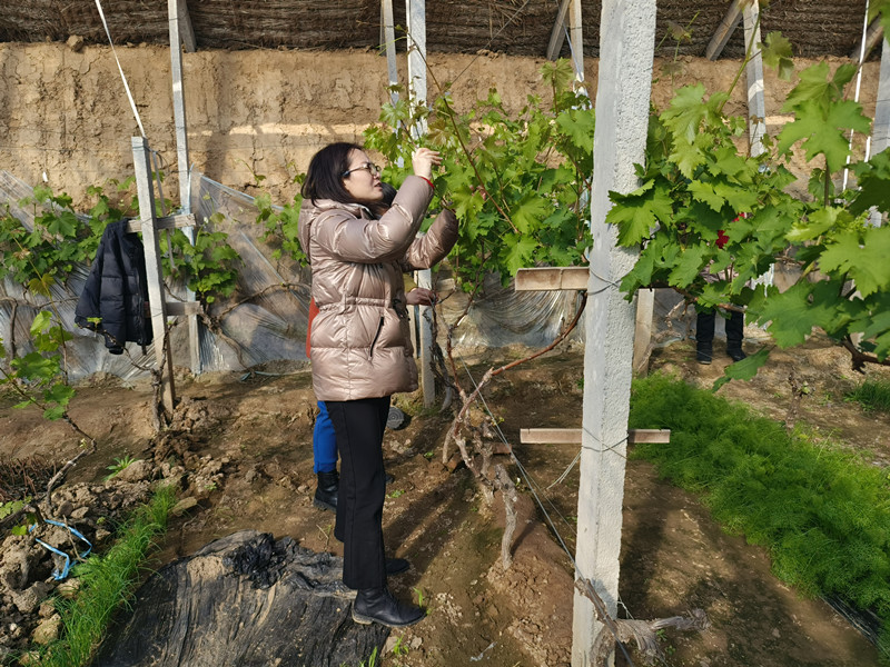 2023年2月13日,葡萄研究室楊麗麗主任帶隊到衡水饒陽縣開展葡萄優系的區試試驗。首先在衡健基地冷棚內栽植砧木80余株,用于后期優系嫁接,同時對園區的陽光玫瑰葡萄萌芽期注意事項進行指導;隨后到東崔村察看2022年在溫室中嫁接的優系,經檢查,嫁接枝條長勢良好,部分新梢已抽出花序,今年會有部分結果。