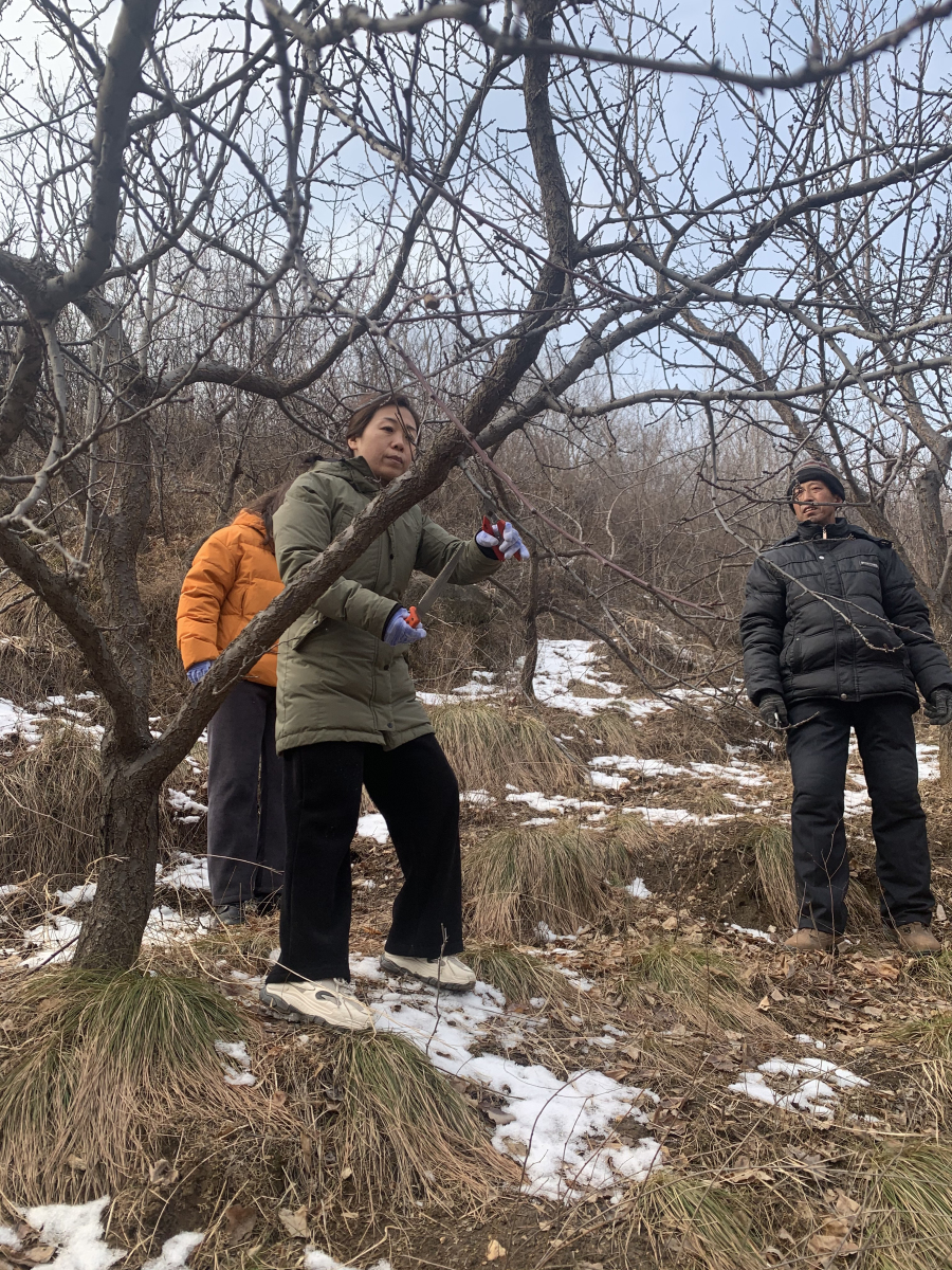 團隊一行實地查看了園區杏樹種植情況,該園區杏樹種植在山坡上,缺乏管理,放任生長,樹體高大,結果部位嚴重外移,且果實質量較差。武曉紅主任根據實際問題,為園區技術員詳細講解了杏樹修剪原則及修剪方法,并現場示范了杏樹冬季修剪技術。因園區內杏樹種植在山坡上,立地條件較差,采摘不便,在修剪時,要把握因樹修剪,隨枝做形,統籌兼顧,長遠規劃的原則。綜合實際情況,對其園區的杏樹進行開心形改造,并對外圍枝進行回縮,打開光路,集中樹體營養。同時武曉紅主任為園區內杏樹種植長期規劃提出了解決方案:一、加強杏樹管理,通過修剪,改變樹體結構,改善通風透光條件,從而提高果實質量;二、對園區內砧木嫁接優良鮮食杏品種,提高經濟效益,做好區塊規劃,杏李崗位團隊根據園區需求可為其提供優良新品種接穗;三、因去年園區內李小食心蟲發病較重,今年要及時觀測園區內的發病情況,且要做好預防工作,可通過生物防治及物理防治等多種防治措施并用,以達到防治目的。