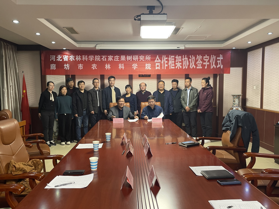龐昭進(jìn)所長、褚鳳杰書記、董輝副所長帶領(lǐng)所內(nèi)相關(guān)果樹專家及科技管理人員出席了此次簽約儀式。廊坊市農(nóng)林科學(xué)院院長陶春來、副院長杜德玉和梅仕能、科研管理處及相關(guān)業(yè)務(wù)所人員參加了此次簽約儀式。