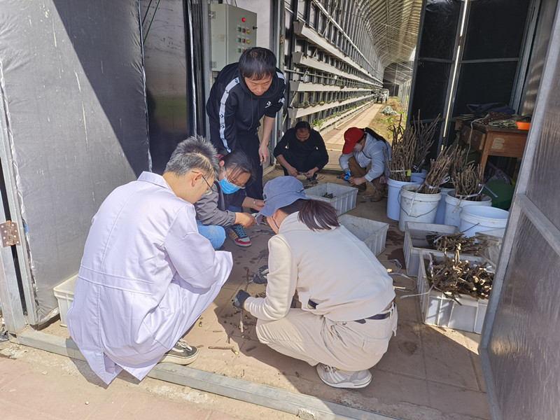 楊麗麗研究員和魏建國高級農藝師充分發揮老帶新作用,向大家講解扦插和嫁接的技術要點,并親自指導新人和實習學生的操作。團隊成員間配合密切,從整地平地、剪取插條、蘸生根粉、拉線打樁、扦插、剪取接穗、嫁接,到最后澆水,大家主動配合,圓滿完成6個優系和品種的扦插和嫁接工作。