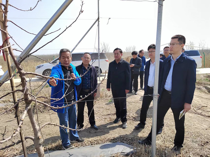 2023年3月30日調研組對我所濱海鹽堿區果品綠色生產技術示范基地(中捷農場)進行調研指導。馮建忠副所長就我所基地建設的初衷,品種技術示范及取得效益情況進行了匯報。褚鳳杰書記、馮建忠副所長著重就基地鹽堿情況、土壤改良、節水保墑、簡化樹形培養等方面與調研組領導和專家進行了深入交流。省政府及省農業廳領導對我所在果樹鹽堿地綜合利用方面取得的成果和示范帶動作用給予允分肯定和高度贊揚。