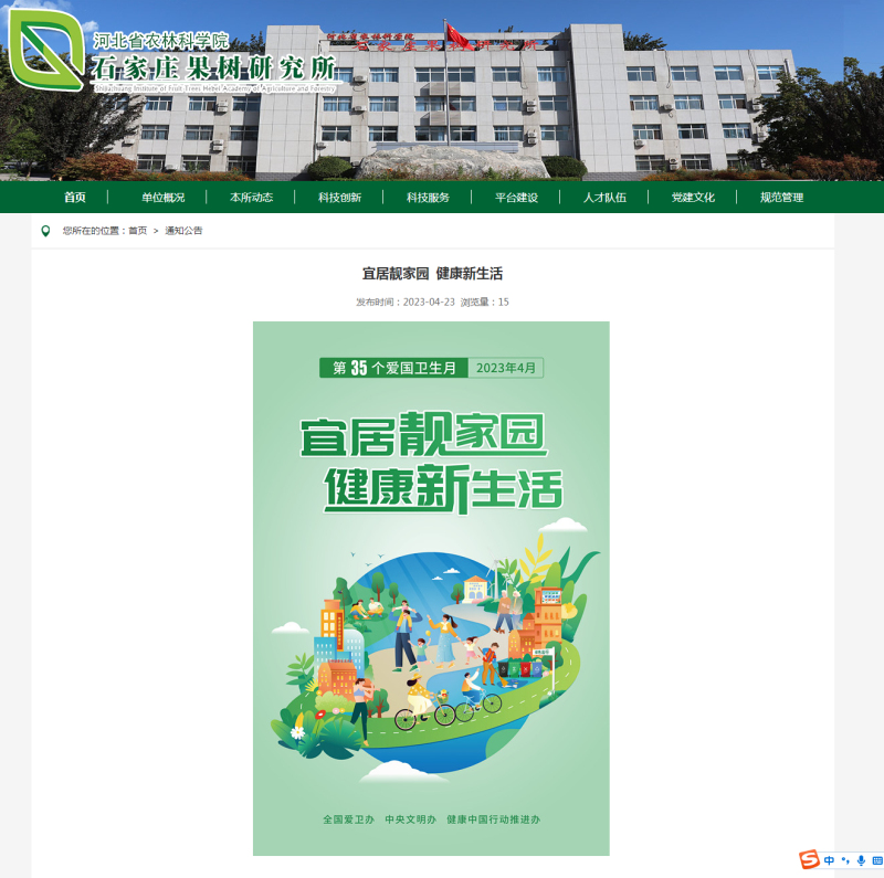 近期,按照院機關黨委相關通知要求,結合工作實際,我所組織開展了愛國衛生月活動。通過展示愛國衛生月宣傳海報、播放文明健康生活方式宣傳片等形式,開展輿論宣傳教育,強化干部職工“每個人是自己健康責任人”和“文明健康綠色環保生活方式”意識。