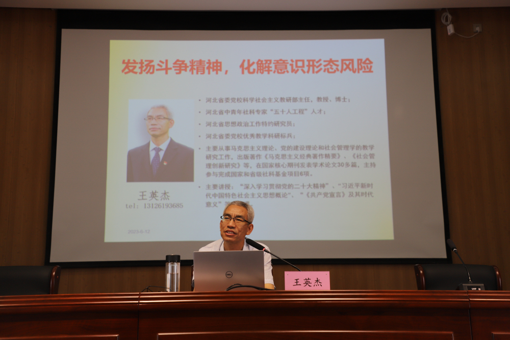 為深入學習貫徹習近平新時代中國特色社會主義思想和黨的二十大精神,根據黨總支學習安排計劃,2023年6月12日,黨總支邀請省委黨校科社教研部主任王英杰教授作專題報告。王英杰教授以“發揚斗爭精神,化解意識形態風險”為題,圍繞意識形態的重要性、當前意識形態領域面臨的重大風險挑戰、建設具有強大凝聚力和引領力的社會主義意識形態等三方面進行了深入系統的講解,授課語言通俗易懂,內容豐富深邃。