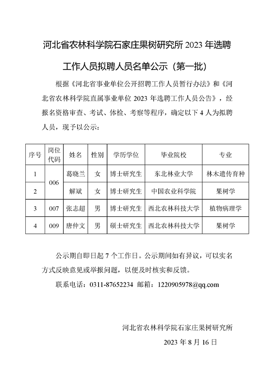 河北省農林科學院石家莊果樹研究所2023年選聘工作人員擬聘人員名單公示(第一批)