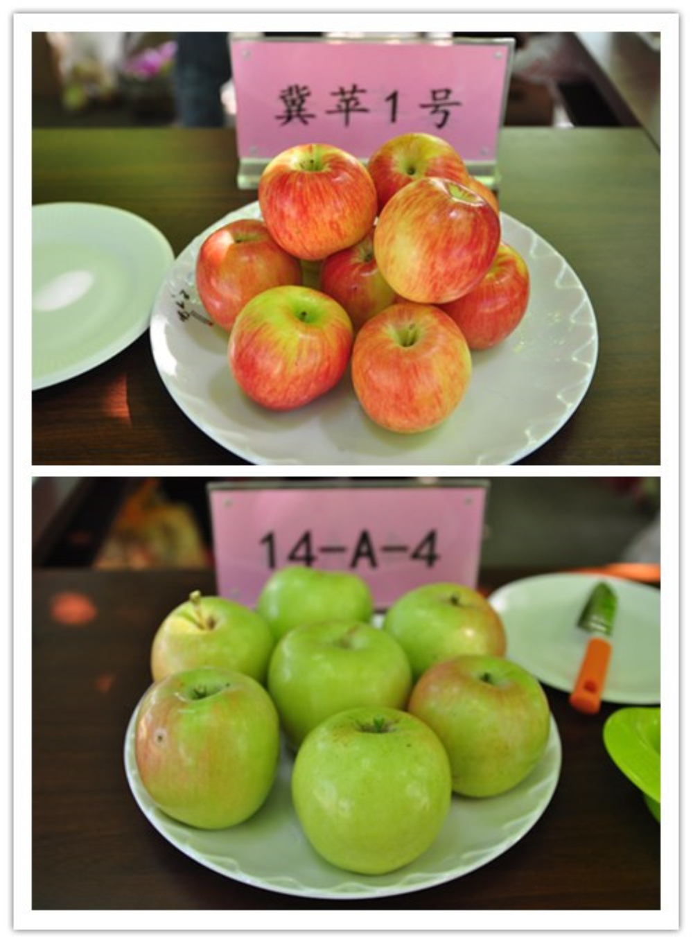 本次品鑒活動展示了來自我省石家莊果樹研究所、昌黎果樹研究所、河北農大等育種單位和石家莊、邢臺、衡水、保定、秦皇島等不同產區的17個新優系、20余個品種及共計40余份蘋果中早熟樣品。資源評價與新品種選育崗位專家李學營研究員逐一介紹了中早熟品種(系)‘冀蘋1號’、‘魯麗’、‘華碩’、‘藤牧一號’、‘陽光嘎啦’、‘西瓜海棠’、‘華美’、‘金世紀’、‘美八’、‘紅脆寶’等品種特性,以及石果所最新培育的‘6-1-20’、‘14-A-4’、‘11-24’、‘5-1’等苗頭品系特性;隨后通過現場品鑒,對各個品種(系)的果實外觀和內在品質進行了綜合評價,大家對我所近年培育的中早熟新品種‘冀蘋’系列給予了高度評價。同時針對專家和果農關心的中早熟品種及優系‘6-1-20’、‘14-A-4’、‘11-24’的栽培生長情況進行了現場觀摩。