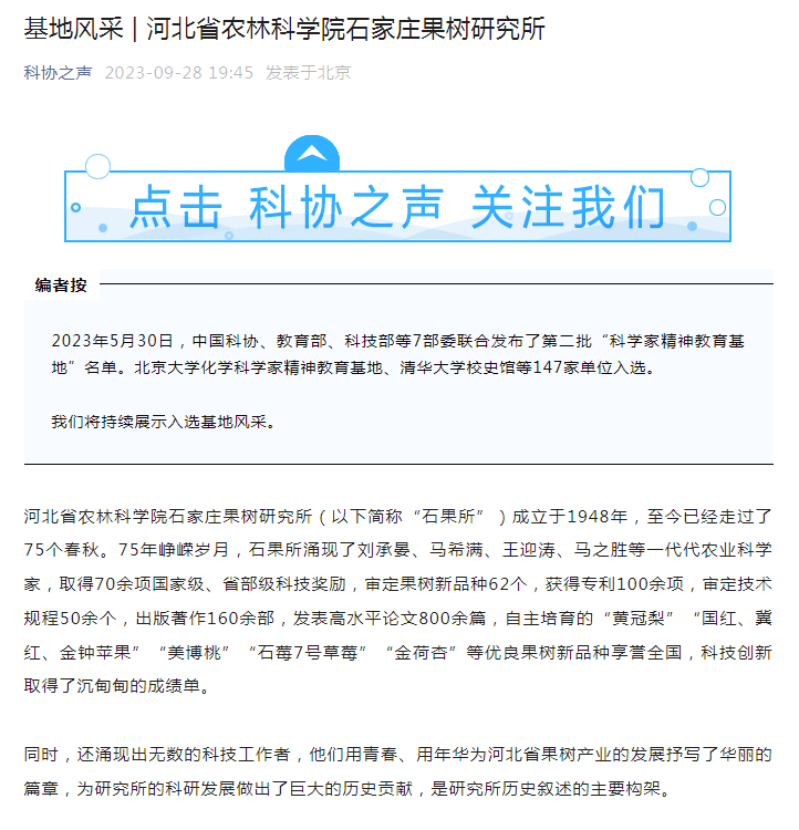 一直以來,我所高度重視弘揚、傳承、踐行科學家精神,中國科協的宣傳報道既是對我所科學家精神教育基地的認可也是對基地今后工作的鞭策。石家莊果樹研究所珍惜來之不易的成績,繼續做好本職工作,發揮基地作用,將科學家精神發揚光大。