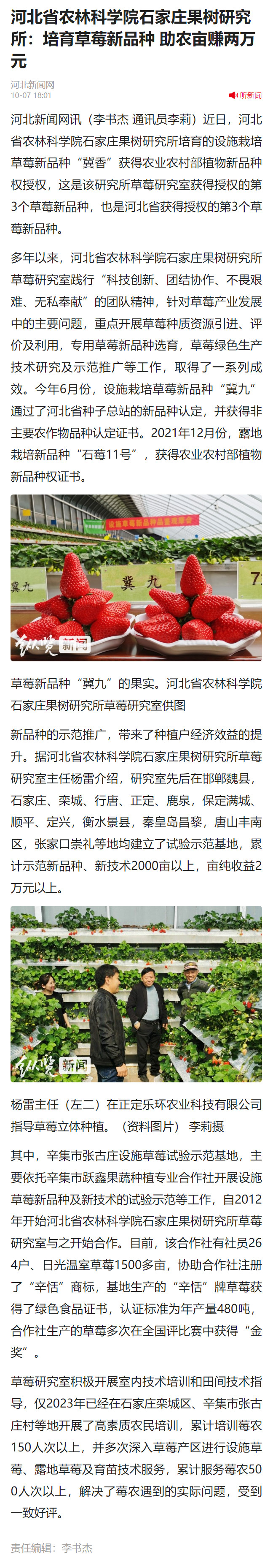 草莓研究作為我所發展較快的優勢學科,著力做好科技創新、科技服務等方面工作,熱誠服務于廣大草莓生產者。近日,河北日報網(縱覽新聞)對草莓研究團隊進行了宣傳報道。