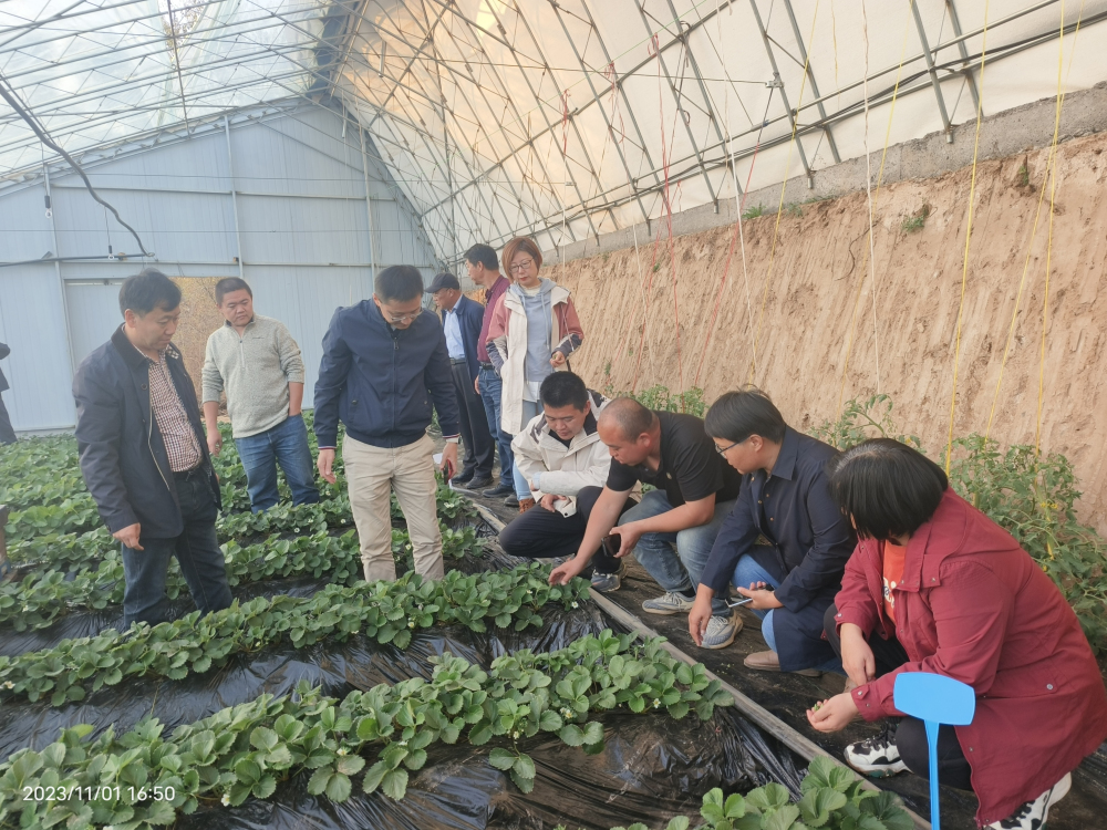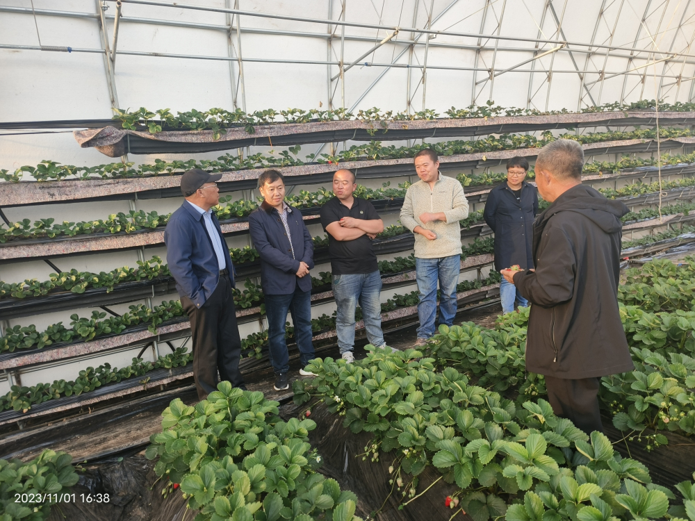 2023年11月1日,石家莊果樹研究所草莓研究團隊對接國家特菜體系草莓崗位專家王桂霞研究員團隊、國家特菜體系保定草莓綜合試驗站站長李青云教授及主要成員張?華教授、保定市草莓研究所趙輝所長及?鋒正?級農藝師赴保定市博士農產順平縣沃野草莓農業有限公司進行考察調研。在當地農業農村局局長劉春暉、順平縣沃野草莓農業有限公司負責人楊玉想等人的帶領下,崗站專家實地查看了設施草莓的種植情況,并從品種、品質、種苗、綠色生產及品牌打造等方面進行了深入交流,為加快實現順平農業強縣場景貢獻力量,把精品草莓做成強縣富民的優勢特色產業。隨后,崗站專家一行輾轉來到河北保定淶源高地農業科技開發有限公司,考察了這里的四季草莓、冷藏苗促早上市草莓、以及草莓種苗的繁育情況,并探討了如何對石家莊果樹研究所自育新品種(系)的共同開發。