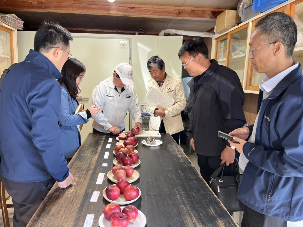 團隊針對紅肉蘋果在日本的品質表現及市場流通情況、紅肉蘋果在國內的發展前景、日本梨常用矮化砧木及效果等問題,在伴野教授及團隊的帶領下,考察了信州蘋果研究所、南信農業試驗場、蘋果釀酒廠、選果場,及信州地區蘋果密植園及松川町梨園等。在信州蘋果研究所品鑒IHR17等7個超級紅肉蘋果優系果實品質,觀察其研究圃內種植的蘋果、梨品種生長特征及果實品質,交流栽培管理經驗。在蘋果密植栽培園及松川町梨園,交流密植園樹形、產量及老果園耕作模式、更新過程等問題。與南信農業試驗場梨栽培研究員交流南信試驗場主栽梨品種及砧木,討論根腐病試驗處理及效果、連干V字架式樹形優缺點等。在蘋果釀酒廠交流釀酒所用品種、流程及投入產出比等。并前往農產品直銷點,調研當地農產品流通價格及收益情況。