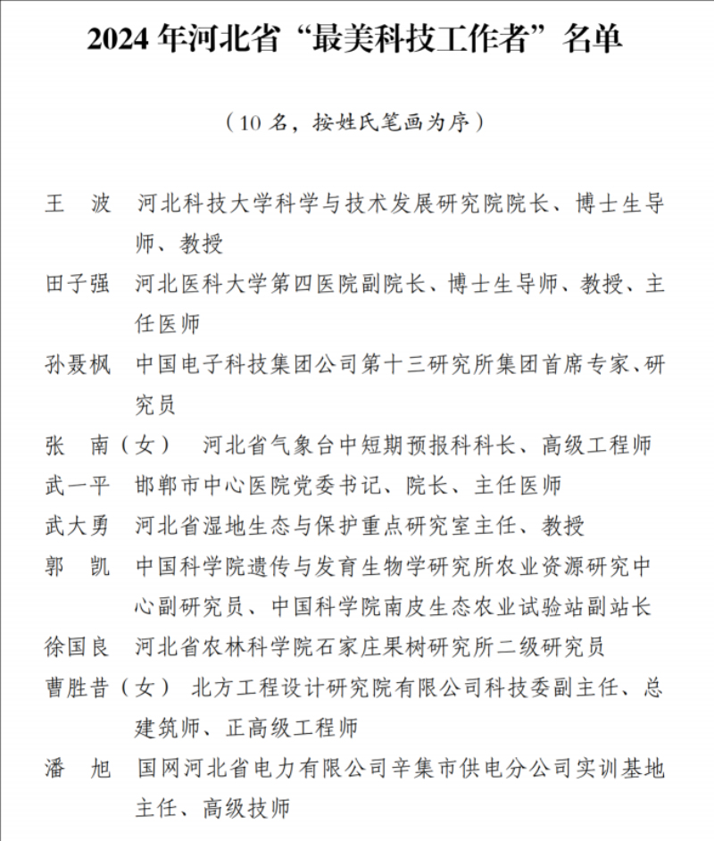 近日,中共河北省委宣傳部、省科協等五部門聯合發文公布2024年度河北省“最美科技工作者”稱號獲得者名單,我所徐國良研究員入選。此次評選活動于2月份開展,經組織推薦、資格審查、事跡展示、專家評審和社會公示等環節,確定了10人獲此稱號。他們是長期奮戰在科技戰線的廣大科技工作者的優秀代表,以實際行動生動詮釋了“愛國、創新、求實、奉獻、協同、育人”的新時代科學家精神。